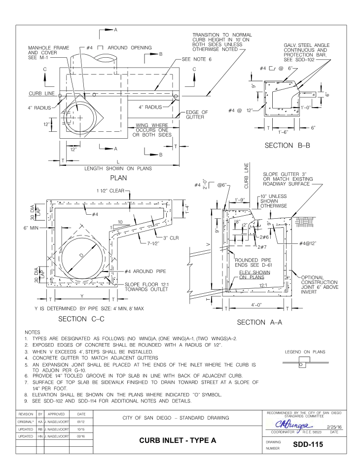 The Type A Curb Inlet is split in half by the curb line. The 24" heavy traffic ring and cover sit in the street in front of the curb. This structure has a 4' x 4' core that will extend full height from the pipe to the curb. This Curb Inlet collects water from the gutter and drains into pipe below. Typically it will have one pipe coming out of it, but may have more pipes if necessary. Typically this structure is used if the pipe is parallel with the curb line, and in the street or directly under the curb line. Another use would be if there were exisiting utilities behind the curb that required a narrower structure. The Type A Curb Inlet can also have one, or two wings. The purpose of the wings is to create a larger opening in the curb for a higher volume of water. Typically you will see these on, or at the bottom of, hills. They would be known as a Type A1, or Type A2 for one or two wings respectively.