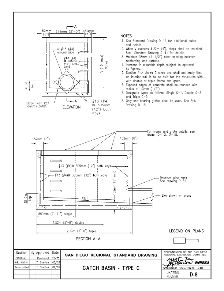The Type G Catch Basin is normally used in parking lots. This Catch Basin has a core dimension of 2' x 3' that will extend full height from the pipe to the curb. The 2'x3' heavy traffic frame and grate are centered on the top of the structure. Typically it will have one pipe coming out of it, but may have more pipes if necessary.